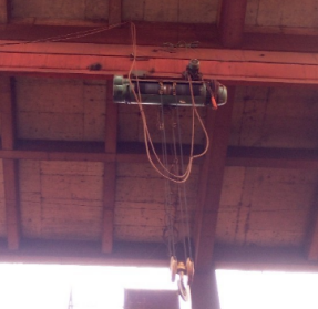 一種操作方法是:利用梯子到達(dá)平臺(tái)處,在一根鋼絲繩的兩端分別捆上麻繩,吊上合適的配重物資,把麻繩蕩到單梁的兩側(cè),鋼絲繩的中間點(diǎn)用麻繩拉住,等兩端的鋼絲繩都到下面的平臺(tái)了,要連個(gè)人在線面分開拉鋼絲繩,中間的麻繩往上提,使鋼絲繩躲過軌道上的兩輪凸起結(jié)構(gòu)件,再把鋼絲繩移到單梁的中間部位,再兩鋼絲繩頭都拉到平臺(tái)處,用手拉葫蘆一點(diǎn)點(diǎn)的把單梁葫蘆拉到檢修平臺(tái)的上方。